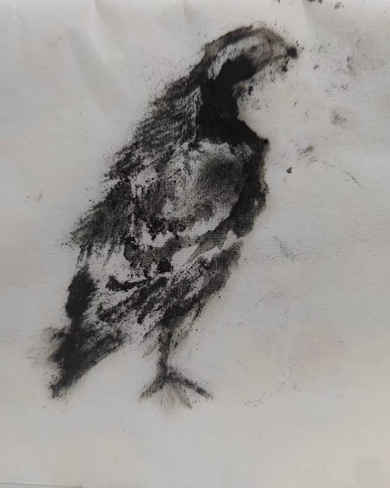 这幅画取材于中国古代文人画中常见的鸟意象——它们从来不是单纯的自然再现,而是精神与隐喻的载体。作品用煤粉完成,将毛笔的提按顿挫与煤炭原始、不可控的涂抹感结合在一起。 画中的鸟似乎静止不动,又仿佛随时要振翅而去,悬于静与动之间。对我而言,鸟是极为私人的象征:它代表着我对自由的渴望,对超越现实框架的冲动,对摆脱规训的想象。