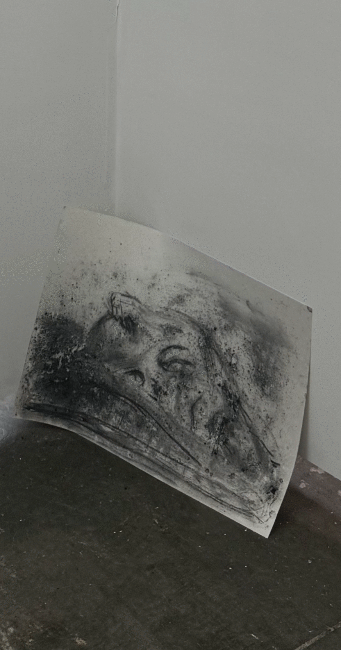 This work is not simply a drawing but a spatial event. The coal-dust portrait of a shattered head — inspired by Percy Bysshe Shelley’s Ozymandias — is deliberately placed low to the ground, tucked into a neglected corner of the exhibition space. Its position is crucial: it resists the “white cube” convention of central, monumental display and instead invites an almost accidental, intimate encounter. Inspired by the continuation of Shelley’s poem —