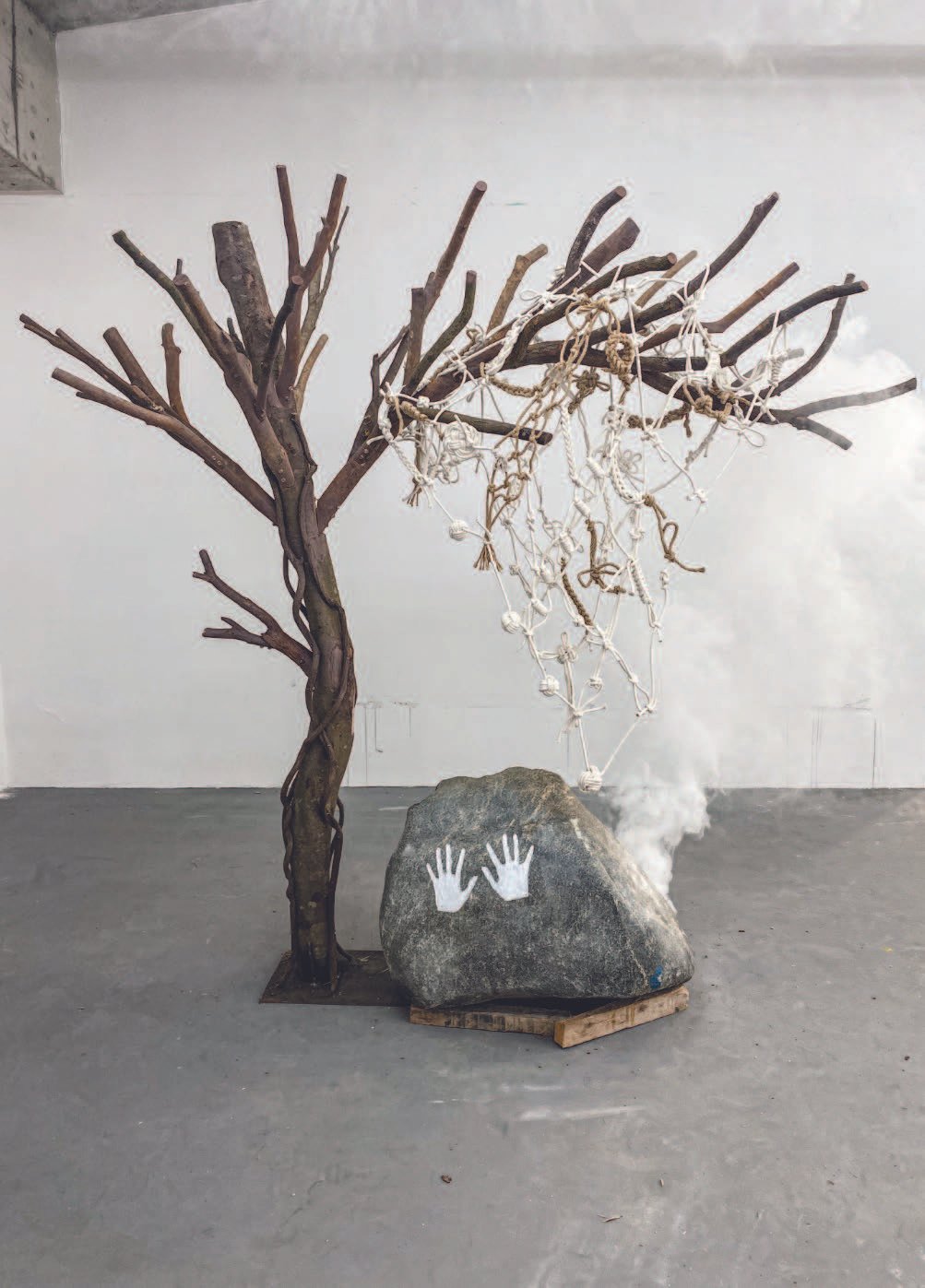 这件作品汇集了树枝搭建的树、结绳的网、带有我手印的石头和缓缓升起的烟雾——四个元素共同构成我对时间、记忆与生活的思考。树呼应植物成煤的深时过程,暗示一切生命都是时间的沉积。绳结网呼应古老的记录方式——结绳记事——却像达利画中软化下坠的时钟,象征即便是记忆的系统也终会松弛、失效。 石头是我的西西弗斯之石:我一次次推它,在上面留下白色手印,像一枚枚努力的勋章。这不是象征性的动作,而是真实的体力劳动,让我落地、让我回到当下。烟雾缓缓升起,却总从网中溢走——提醒我最诗意、最美的瞬间是无法被归档、捕捉或发布的。 在一个生活常常被用来“记录”的时代——为社交媒体而摆拍、剪辑、证明——这件作品反问:如果我们只去好好生活呢?如果真正的任务是推石头、感受重量、与烟雾一起呼吸,明知它会消散呢? 作品的结论不是绝望,而是一种立场:即便网兜不住,我依然选择继续打结、继续推石、继续生活。这是我的存在主义回应:生活不是为了保存,而是为了去活,每一秒都在对虚无主义进行抵抗。